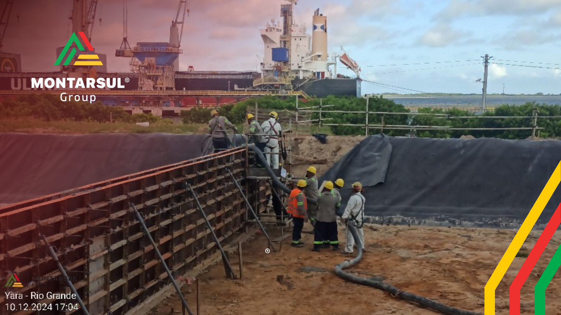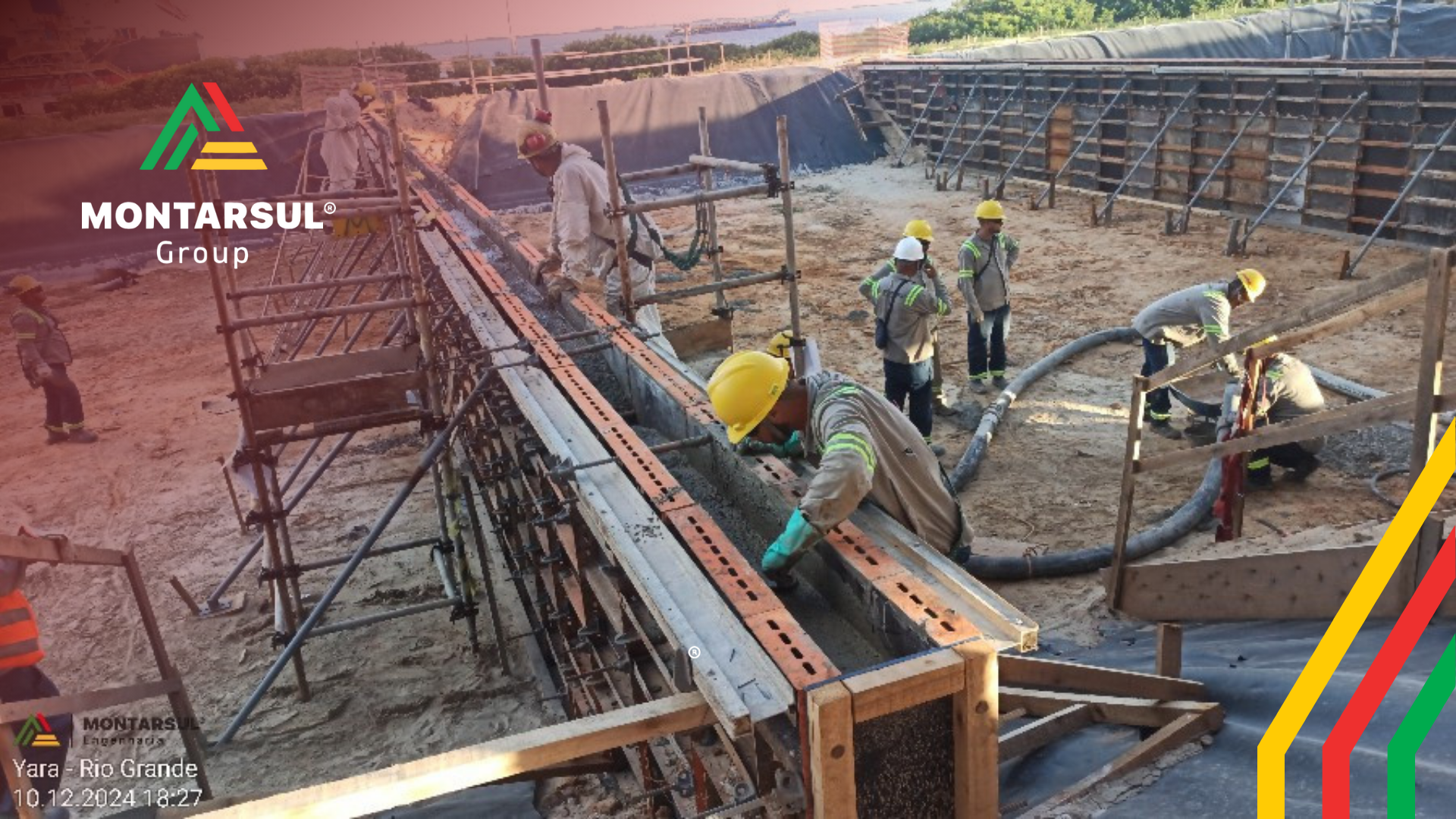 Com o terreno devidamente preparado, a construção avançou para a etapa de estruturas de concreto, que formariam a espinha dorsal do sistema de filtragem.